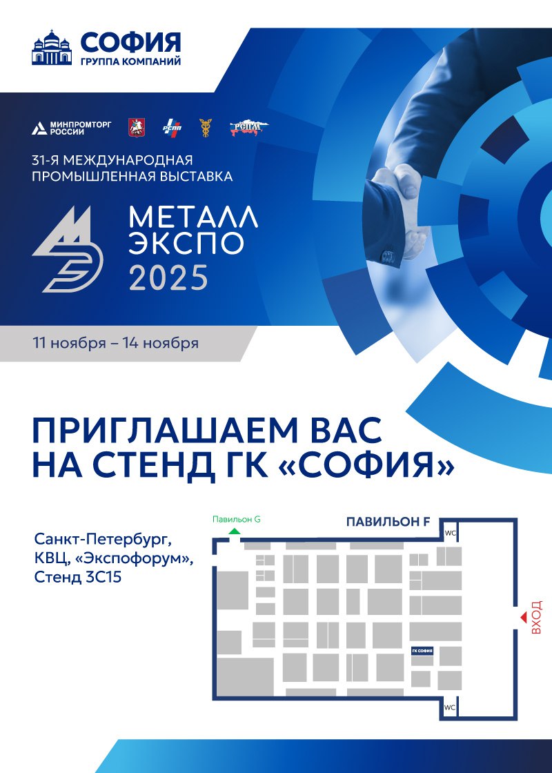 Приглашаем Вас посетить стенд ГК София на выставке Металл-Экспо, которая в этом году пройдет с 11 по 14 ноября в КВЦ «Экспофорум», Санкт-Петербург.